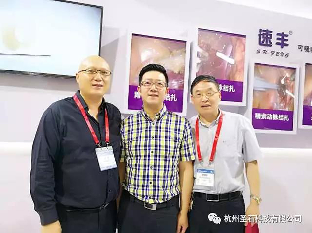 河南省醫(yī)學會微創(chuàng)外科分會新老主任委員河南省人民醫(yī)院微創(chuàng)中心主任張超教授及武警河南總隊醫(yī)院普外科主任趙國強教授也特意到訪我司展臺,與我司石磊董事長合影,表達對代表國貨優(yōu)質(zhì)產(chǎn)品速豐?的認可與支持。